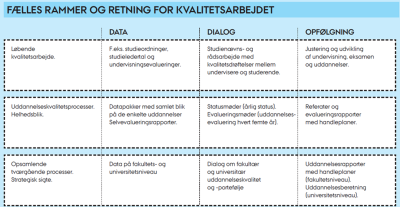 Aarhus University has developed a quality assurance policy for teaching and learning that charts a clear, value-based course for assuring the quality of AU’s degree programmes. The quality assurance policy is based on the students’ perspective and focuses on how the university wants students to experience the university – from choice of degree programme, commencement of studies and during studies, to graduation and transition to the labour market.